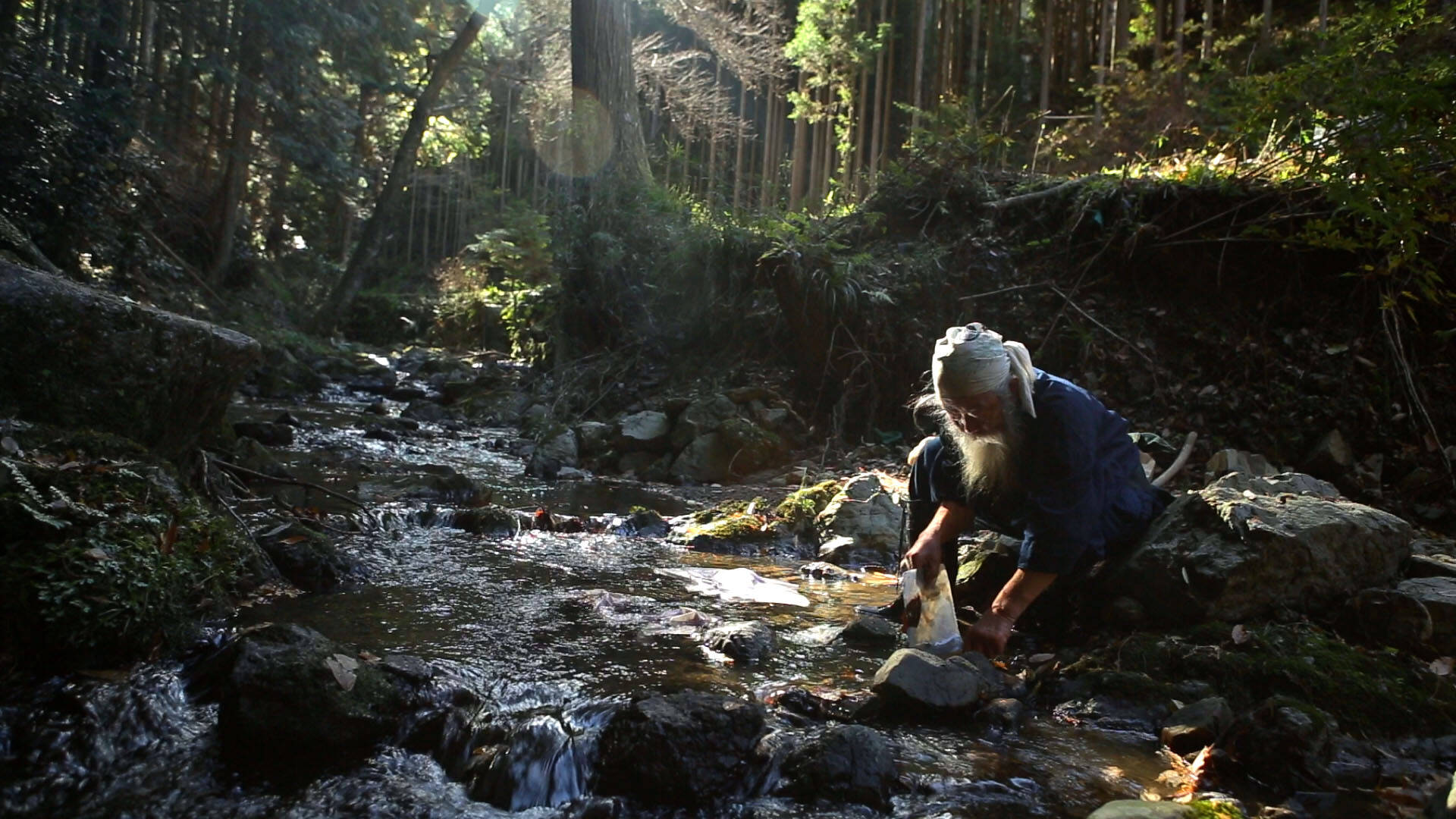 Quand on parle de nature, il ne s’agit pas seulement de faune et de flore mais aussi des minéraux, du vent… Chaque élément a son importance : c’est le fameux Mono no ké (物の怪) que l’on peut traduire imparfaitement en français : « l’esprit des choses » (Miyazaki l’a repris dans son célèbre film Princesse Mononoké). Dans la spiritualité japonaise ancienne, animiste, chaque élément, même le plus infime, est doté d’un esprit. Akeji y est profondément attaché. Cette notion imprègne toute son œuvre mais aussi sa vie. Les plans de nature qui composent le film ne sont donc pas de simples plans d’illustrations. Ils dessinent à leur manière différents portraits d’Akeji : ils représentent son état, son intériorité. Et inversement : Akeji cristallise cette nature. D’ailleurs, il travaille exclusivement avec des papiers et des pigments naturels, en fonction de son environnement et du climat : si le temps n’est pas au rendez-vous, si l’esprit du vent n’est pas manifeste, la lumière du soleil trop forte, aucune création n’est possible. Les plans de nature sont aussi pour nous l’équivalent pictural des « mots de saison ». Associés, ils forment de petits haïkus visuels qui traduisent une atmosphère, une sensation, un changement d’état. Akeji a développé, après cinquante années d’ermitage, une harmonie très profonde avec les éléments. Il se perçoit comme un être vivant parmi les autres. Lorsqu’on lui a fait part de notre souhait d’intituler le film le Maître d’Himuro, il nous a répondu que Senseï, (先生, Maître) était trop réducteur. Il se perçoit plutôt comme un Sumu, (棲む) un terme qui s’applique habituellement aux animaux qui font leur nid à l’abri du regard. Akeji est capable d’anticiper chaque changement de climat, de déceler les signes à peine perceptibles de la nature… C’est une attention que nous, citadins, avons globalement perdu. On la retrouve toutefois dans nos campagnes et c’est un savoir précieux. Ce mode de vie est certes radical mais il présente un véritable contrepoint au consumérisme effréné. Une façon alternative, plus respectueuse d’être au monde. La nature est donc effectivement en plein cœur de notre film… Pour être francs, le retour à Paris a été difficile après le tournage.