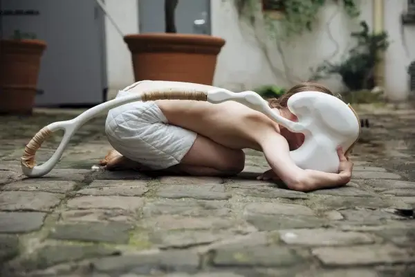 Comment communiquer, créer ensemble entre être animé et objet inerte ? Les sculptures, conçues pour Ruth Childs, invitent à l’invention de gestes permettant de se projeter dans un imaginaire multiforme et mouvant. “L’ambiguïté (…) rend le corps hésitant, curieux, fragile et joueur. Ces incertitudes face aux objets et aux comportements qu’ils insinuent créent une métamorphose perpétuelle du geste, du rythme et de l’humeur.” C’est par cette incertitude qu’objets et danseuse deviennent partenaires. L’objet est à la fois exogène, forme étrange et étrangère, et continuité du corps, prolongement de son ossature. Un trouble que Ruth Childs et Cécile Bouffard entretiennent, ne cherchant jamais à résoudre. Il ne s’agit pas de ne faire qu’un, mais de créer un ensemble en observant les endroits de jonction, là où le corps et l’objet, la danse et la sculpture, peuvent se rejoindre.