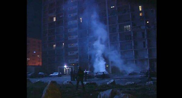 On continue avec Kindertotenlieder, dernière livraison du prolifique Virgil Vernier, qui cette fois se confronte à un matériau historique très contemporain, mythologique déjà avant même que le regard du cinéaste ne vienne le façonner. À l’automne 2005, deux gamins de Clichy meurent électrocutés en voulant fuir la police lancée à leur poursuite. L’embrasement sur plusieurs jours qui a suivi constitue le cadre du court, dans lequel Vernier se plonge dans les archives de TF1 pour en extraire tout ce que la chaîne a pu produire en images durant ces émeutes. Le montage y est brut et contemplatif, sans aucune voix-off ni accompagnement musical. Des morceaux de réalité nus, effarés et sidérants, qui ramènent l’événement médiatique à sa réalité concrète et primitive. En cela, le film figure un envers à la démarche formelle à laquelle Virgil Vernier nous a habitués, œuvrant à ramener le récit mythique à sa substance humaine, prosaïque, contextuelle. Une tragédie sans Moloch donc, sans forces mystiques surplombantes. Le réel n’en a pas usage, il compose avec ses propres démons : ici, un sombre et obscur Ministre de l’Intérieur.