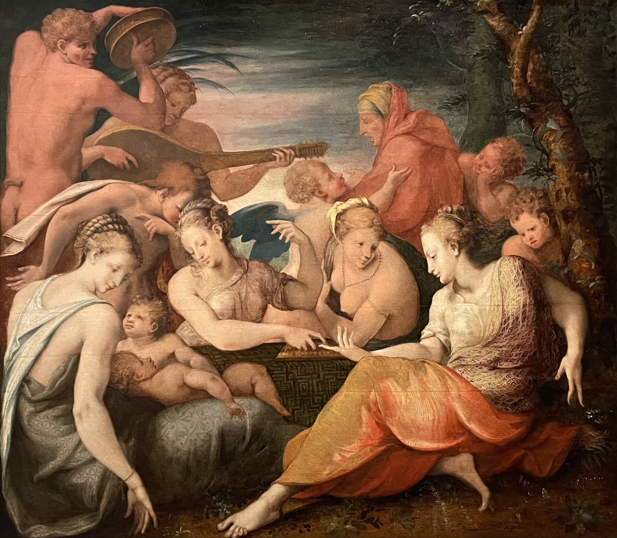 Le château de Fontainebleau et son jardin offraient tous les divertissements propices à la fête, mais il manquait une salle remarquable d’après Francois Ier. C’est donc en 1545 que démarrent les travaux de la salle de bal, qui pouvait aussi se transformer en salle de spectacle si l’on montait une scène. D’ailleurs il faut attendre le mariage de Louis XV (1710 – 1774) au château, pour qu’un théâtre soit créé. Il n’existe plus aujourd’hui. La charpente a pris feu sous le règne de Napoléon III, mais on y trouve maintenant au même emplacement la salle d’exposition temporaire. Il est donc vraisemblable qu’à la cour des Valois la salle de bal suffisait. Elle servait également de salle de banquet et de réception. L’intérêt pour l’Antiquité est omniprésent à la Renaissance, il est donc tout naturel que les peintures à fresque exécutées par Nicolò dell’Abate (1509/1512-1571) d’après les dessins de Primatice (1503 – 1570) entre 1552 et 1556 ornent la salle de bal. Ces derniers représentent des scènes mythologiques, avec une iconographie importante réservée à l’amour (Venus), et à tout ce qui touche à la fête (Cérès, Bacchus, Apollon et les muses).