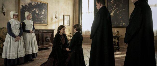 Ce jeu d’échos présent dans la mise en scène se déploie aussi sur un mode allégorique puisque l’histoire – celle d’un enfant qui, choisi par une autorité divine, porte un destin plus lourd que lui et voue sa vie à Dieu – peut nous rappeler certains épisodes bibliques, à commencer par l’épisode fondateur du Nouveau Testament, celui de la vie de Jésus. Mais il ne faut pas confondre Edgardo avec Jésus et l’Enlèvement avec un film habité par la foi catholique. Si le Vatican apparaît sublimé par les ors d’un éclairage très pictural – les maîtres anciens ne sont pas loin – son incarnation, le pape, est un personnage tyrannique jusqu’au ridicule. Sur un mode carnavalesque, Bellocchio va jusqu’à le mettre en scène dans son intimité, hanté par de drôles de cauchemars où il se fait circoncire. Dans l’Italie d’aujourd’hui, toujours sous une certaine influence catholique et dirigée par un gouvernement d’extrême-droite, le pouvoir totalitaire et son cénacle apparaissent finalement pour ce qu’ils sont : une triste farce.