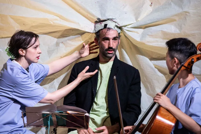 Sans attendre donc, il est question de morceaux, de résidus, de fragments et de fragmentaire, une notion chère au romantisme allemand mis à l’honneur dans le spectacle par Schumann et ses Lieder qui servent de squelette et de charpente à déconstruire et à réagencer dans les différents tableaux qui constituent la pièce. Comme le suppose même le titre du spectacle, Sans tambour, qui vient sciemment éluder la seconde partie de l’expression « Sans tambour ni trompette » qui désigne ce qui arrive sans se faire remarquer et dans le plus grand des secrets, la peine d’amour suppose le vide et l’absence soudains. La maison que toutes et tous au plateau participent à démolir jusqu’à venir en emporter les gravats dans les coulisses dit, concrètement et métaphoriquement, la sensation d’effondrement de celle ou de celui qui perd un amour. Cette maison est une clef de voûte du spectacle comme de l’imaginaire de Samuel Achache. Dès 2017, le collectif La vie brève, emmené par le duo qu’il compose avec Jeanne Candel, montait La Chute de la maison, un spectacle directement inspiré de la longue nouvelle d’Edgar Allan Poe, La Chute de la Maison Usher – là déjà un titre tronqué et lacunaire. Le collectif inaugurait alors ses variations sur le thème de la maison et de l’habiter, approfondi dans Sans Tambour où il s’agit de redonner à ces deux verbes, « habiter » et « résider », toute leur puissance sémantique : celle de ce qui demeure, faisant de la maison et de l’habiter, comme chez Heidegger, cet espace qu’on investit pour y rester, ce lieu qu’on acquiert et qu’on conquiert pour soi et pour tous ceux qui fondent alors ce qu’on avait pour habitude autrefois d’appeler la maisonnée (comme dans la « Maison Usher » de la nouvelle de Poe d’ailleurs).